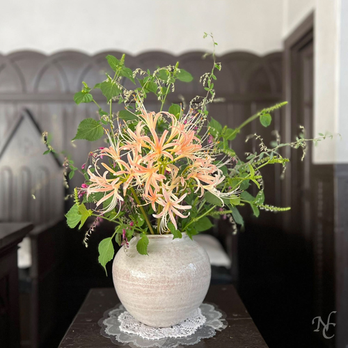 庭の曼珠沙華、萩、紫蘇を活けました。