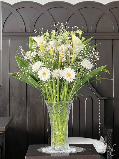 3月15日の午後に行われる結婚式のために活けられた花々が 聖壇を彩ります。