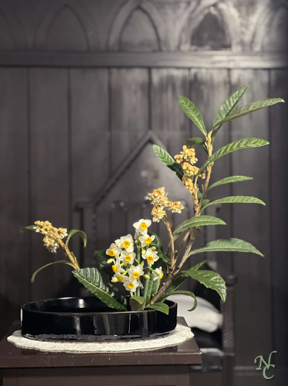 庭の水仙と枇杷の花
